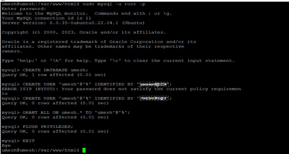 ubuntu@ubuntu: ~$/var/www/html$ sudo mysql -u root -pCreate